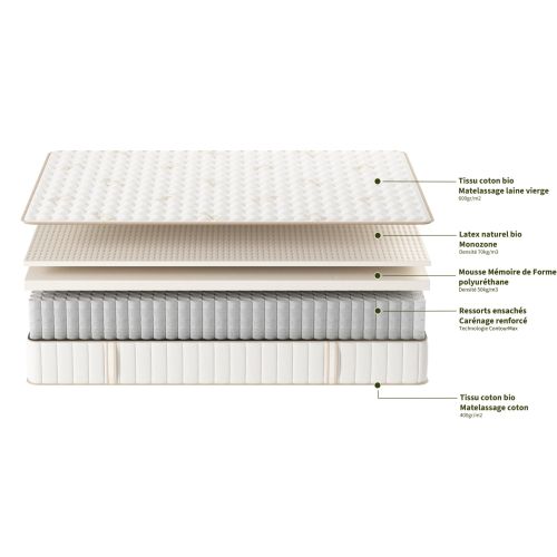 Su base está hecha de una lámina de látex natural orgánico certificado que ofrece una increíble elasticidad para adaptarse a la forma de su cuerpo y aliviar los puntos de presión sea cual sea su posición al dormir.